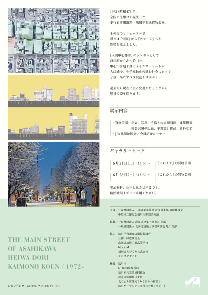 毎年、ADW(旭川デザインウィーク)の時期に合わせ、私たちJIA旭川地域会は、旭川駅舎内のステーションギャラリーで展覧会を開催してきました。 今年は、全国で初めて誕生した歩行者専用道路・旭川平和通買物公園が2022年に50周年を迎え、その歴史を振り返りながら今を見つめ、今後果たすべき役割などを探る内容で、17日より開催しております。21、28日にはギャラリートークを開催し、商店街関係の方々や会場にお越しのみなさまと、買物公園の現状や未来いついて話し合いたいと考えております。お近くにお越しの際は是非お立ち寄りください。